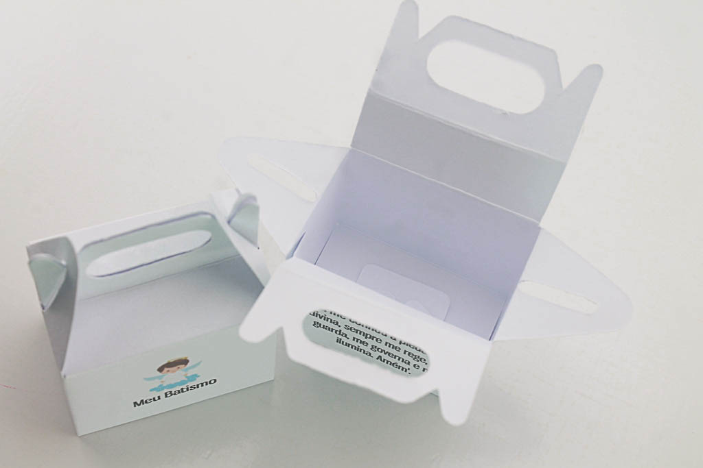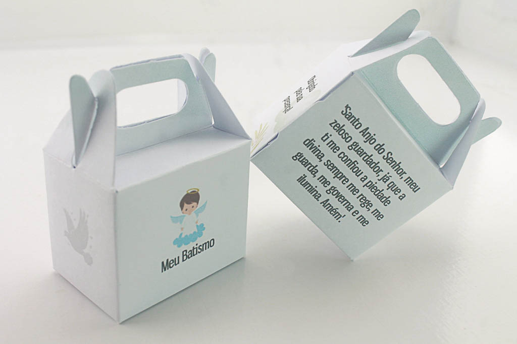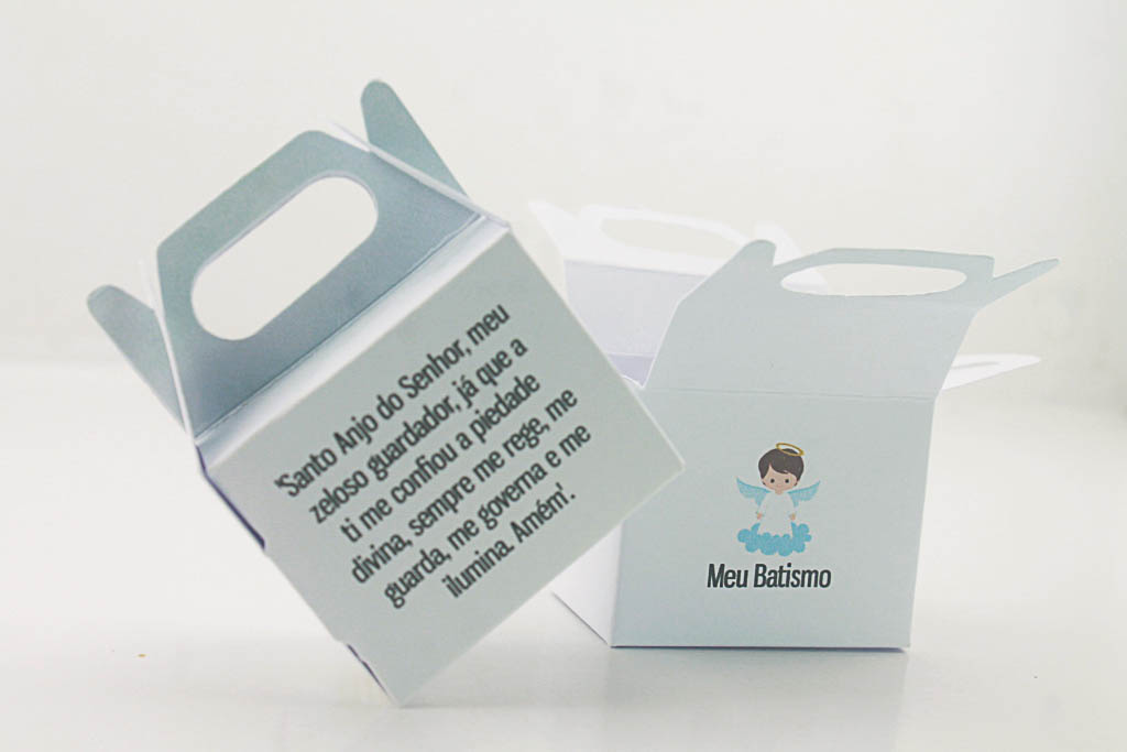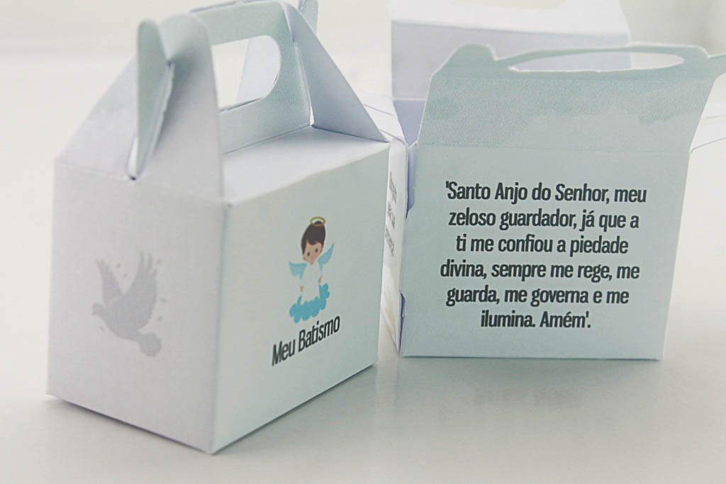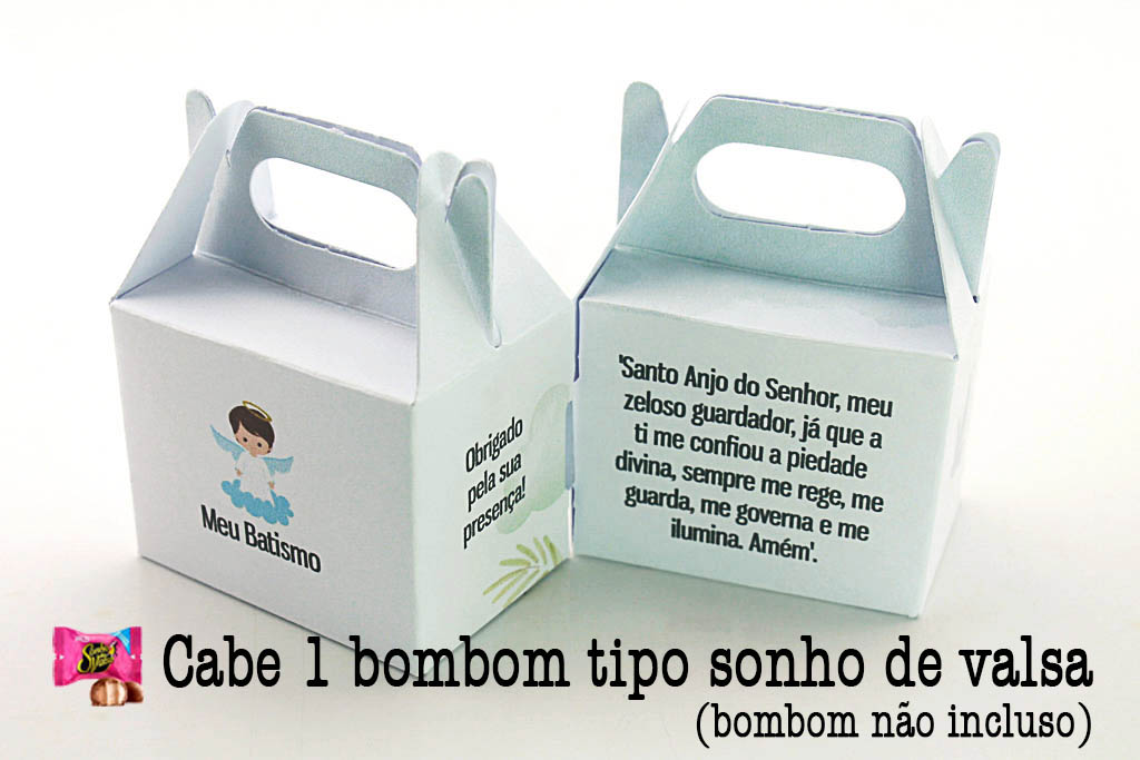 Caixa maletinha branca 5x3,3x4m lembracinha bombom brigadeiro batizado batismo MENINO oração anjinho